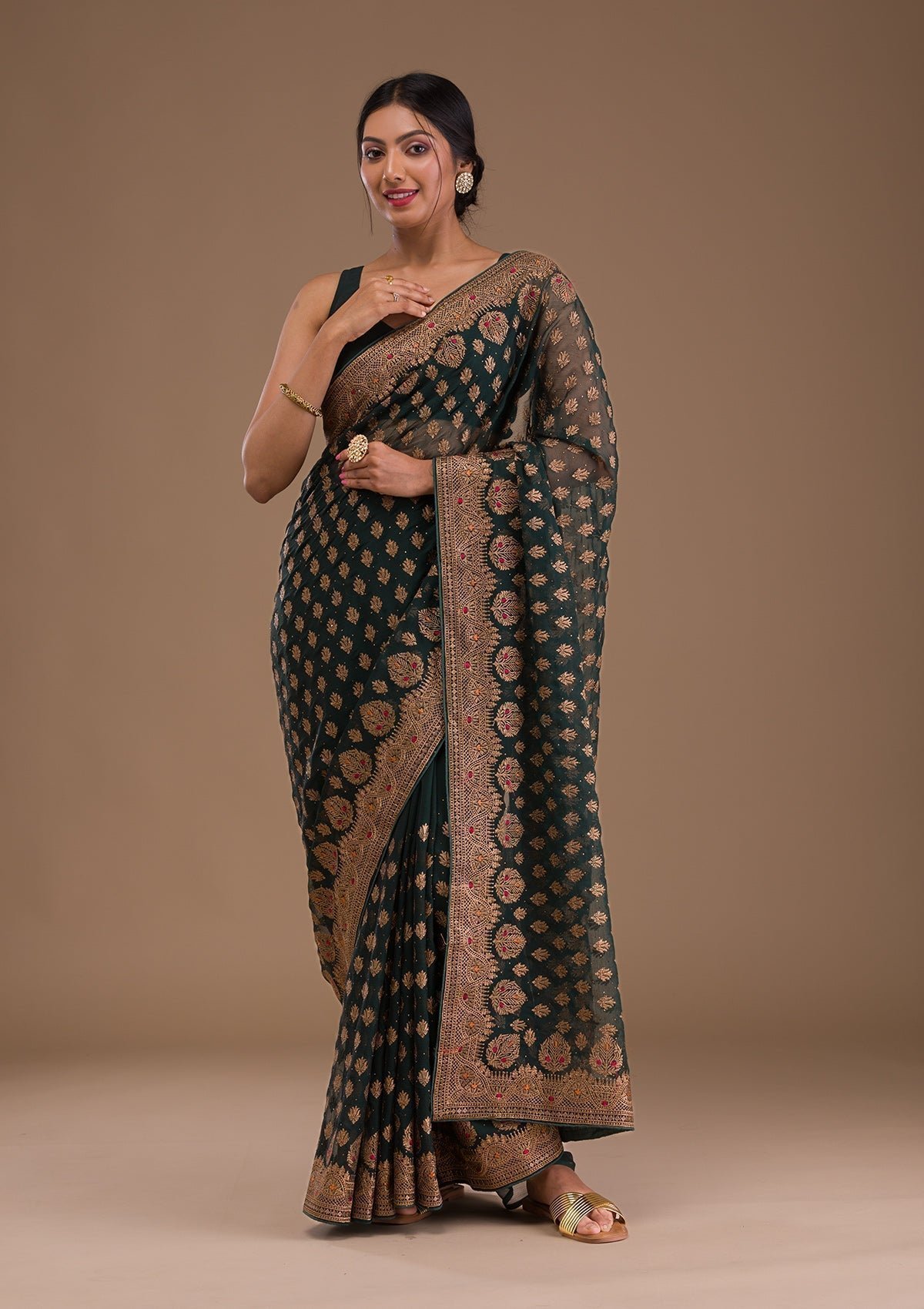 Bottle Green Zariwork Georgette Saree